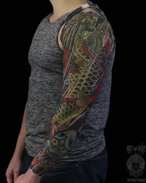 Татуировка мужская япония тату-рукав дракон и маски 3870