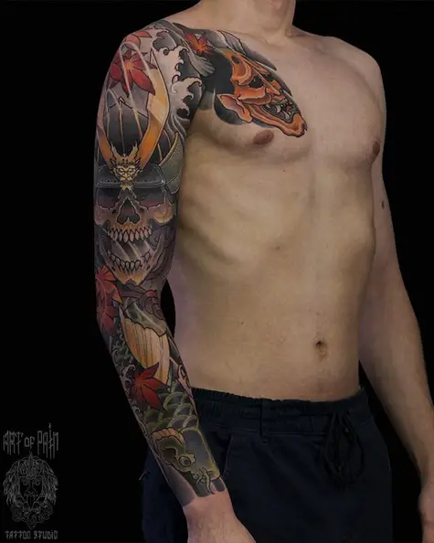 Татуировка мужская япония тату-рукав карп и маски 3882