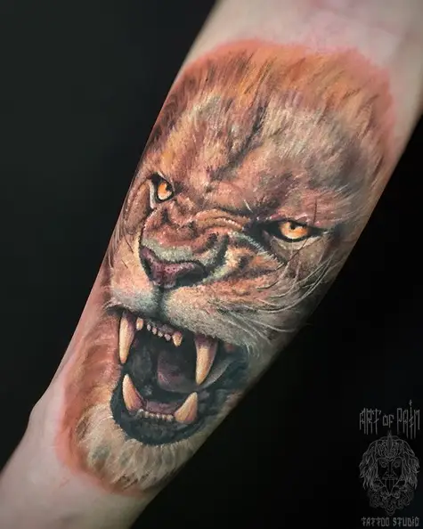 Татуировка мужская реализм на предплечье львиный оскал 3906
