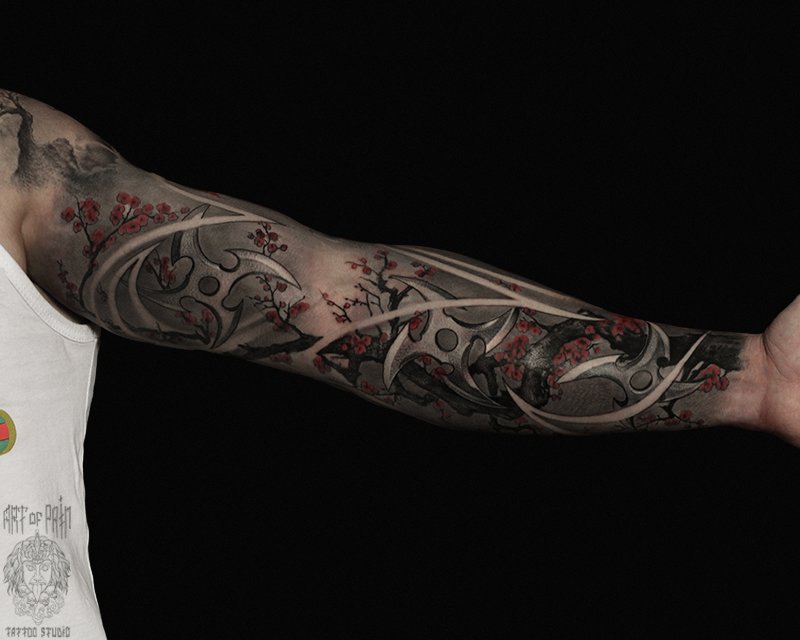 Татуировка мужская реализм тату-рукав звездочки и сакура (Слава Tech Lunatic) 3926