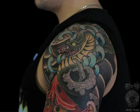 Татуировка мужская япония на плече змея и хризантема 3934