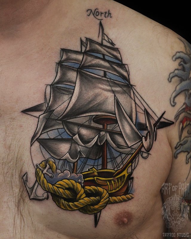 Татуировка мужская олд скул на груди корабль (Юрий Хандрыкин) 3959