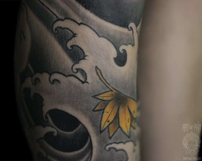 Татуировка мужская япония на ноге волны и лист клена 3989