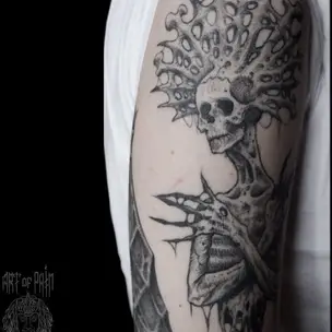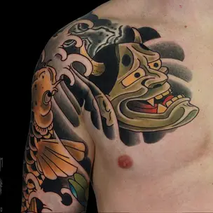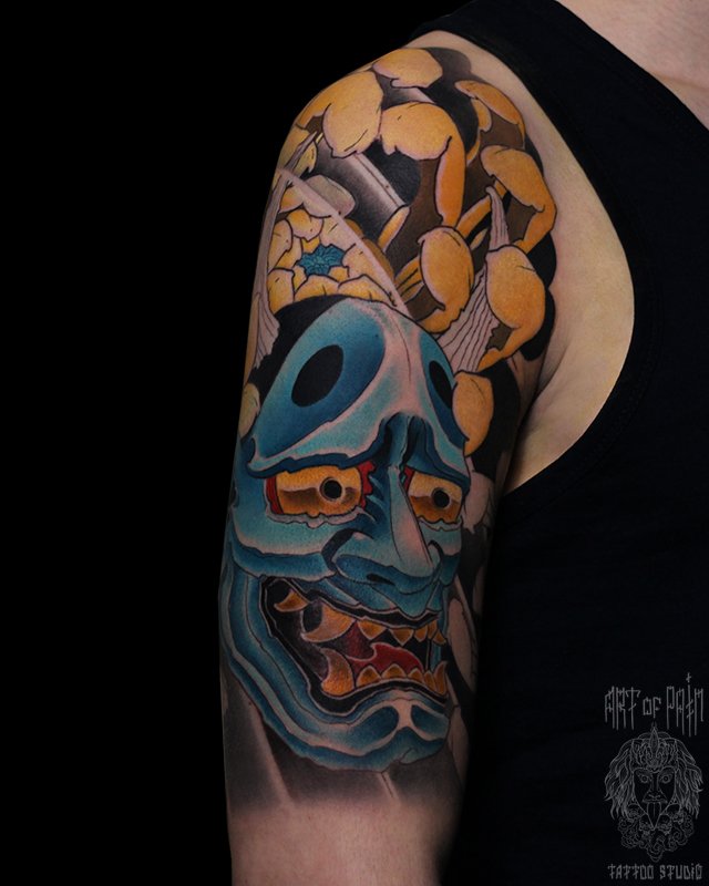 Татуировка мужская япония на плече синяя маска ханья 4001