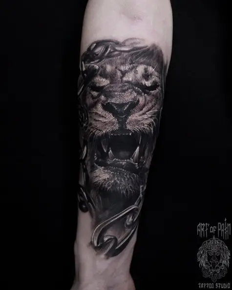Татуировка мужская реализм на предплечье лев и цепь 4009