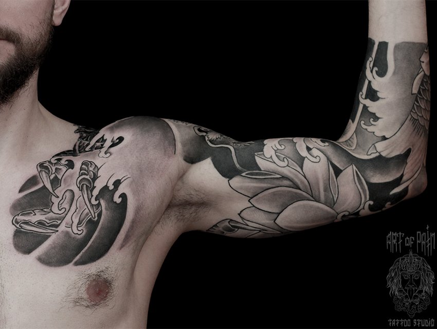 Татуировка мужская япония тату-рукав дракон и лотосы 4027