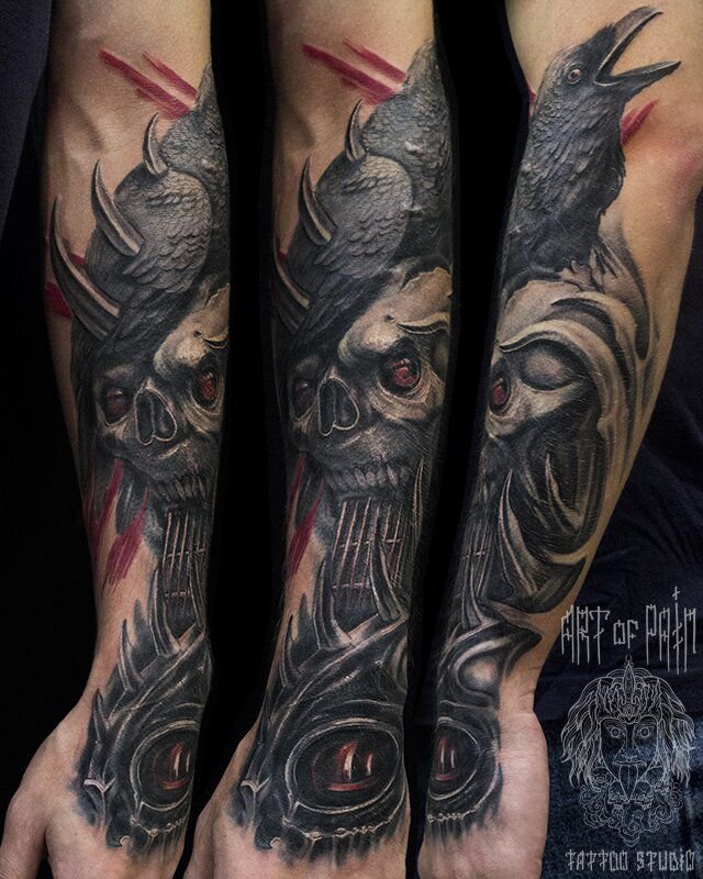 Татуировка мужская хоррор на предплечье череп и ворон 403
