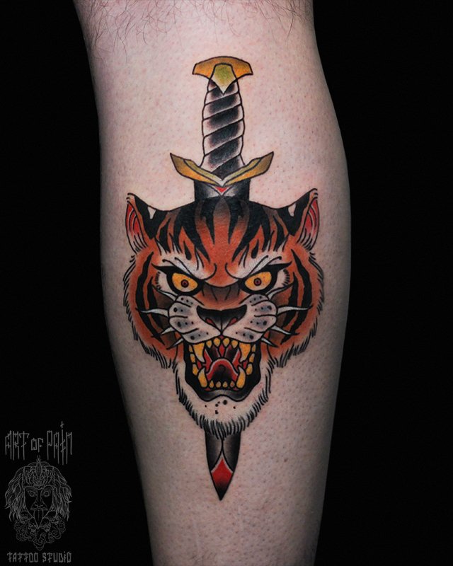 Татуировка мужская олд скул на голени тигр 4048