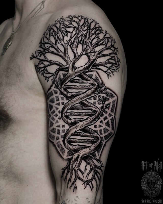 Татуировка мужская графика на плече дерево днк (Юрий Хандрыкин) 4053