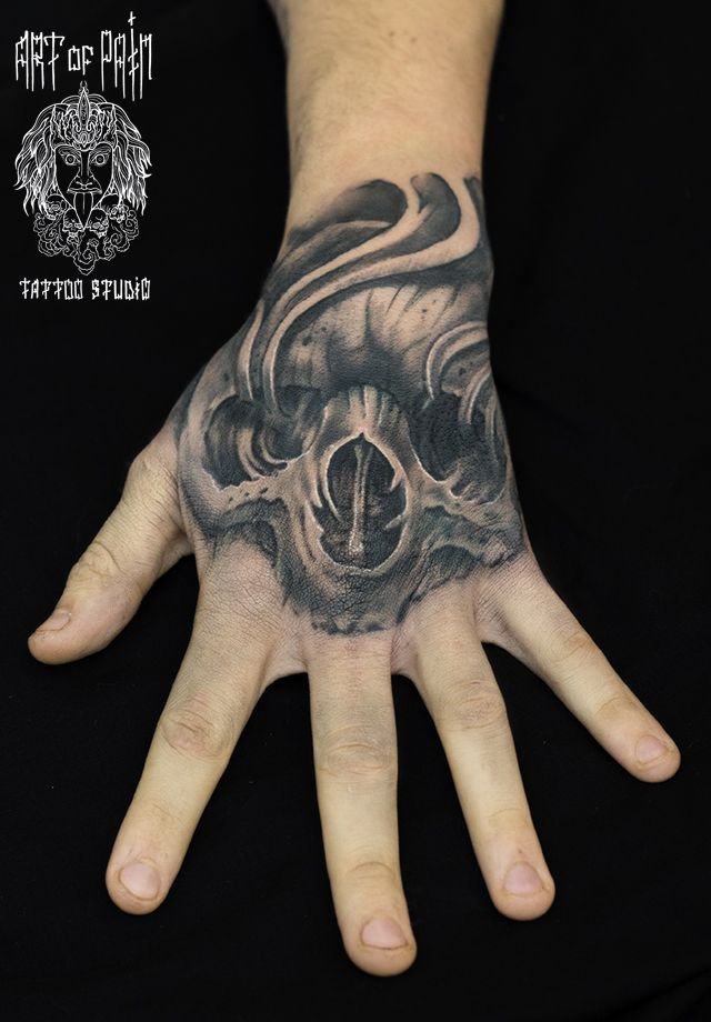Татуировка мужская хоррор на кисти череп и дым 406