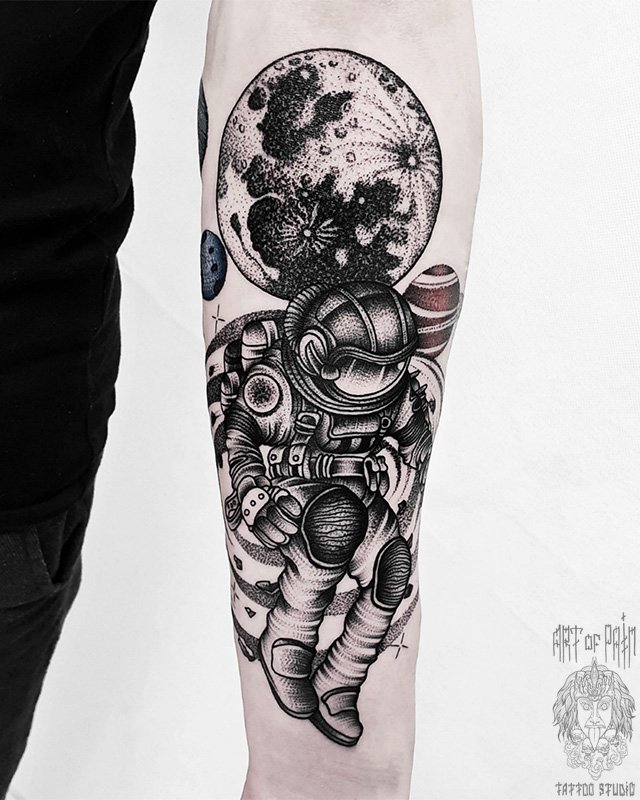 Татуировка мужская графика на предплечье космонавт в космосе 4101