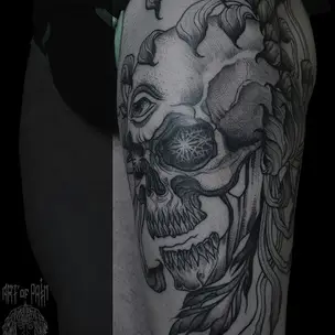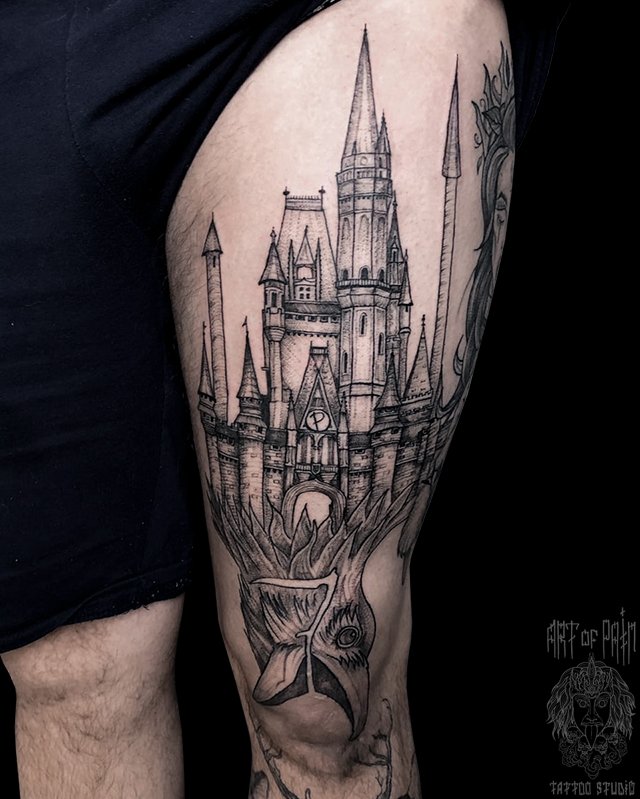 Татуировка мужская графика на бедре ворон замок (Мария Котова) 4234