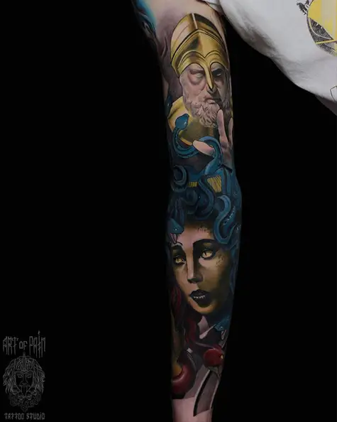 Татуировка мужская фентези рукав Горгона Медуза и герой 4248