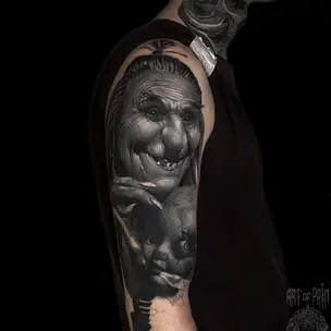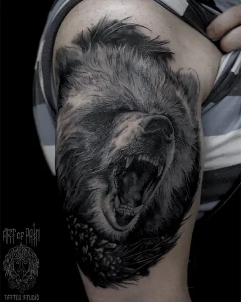 Татуировка мужская реализм на плече медведь и шишка 4259