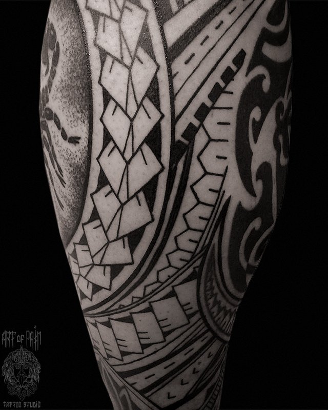Татуировка мужская полинезия на голени узор и скорпион 4303