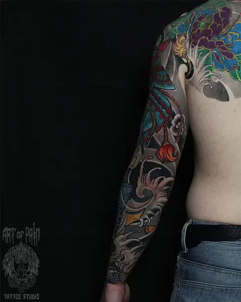 Татуировка мужская япония тату-рукав волк, лотосы, карп (Юрий Хандрыкин) 4335