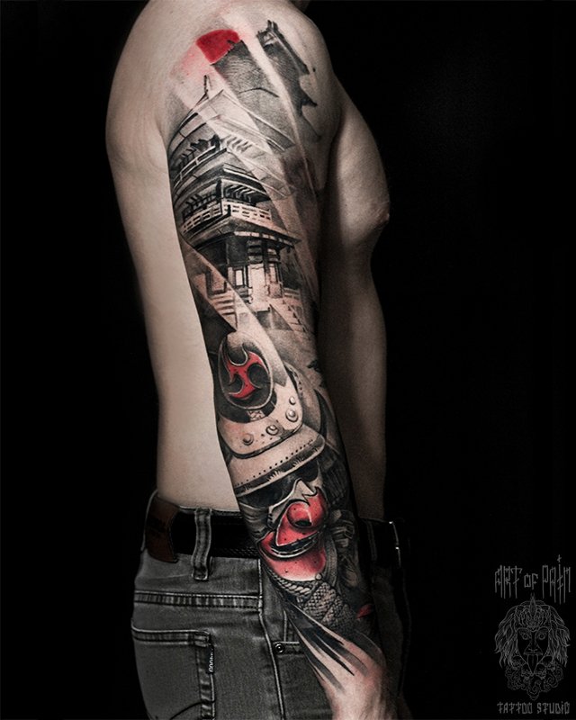 Татуировка мужская реализм тату-рукав самурай, пагода (Слава Tech Lunatic) 4339