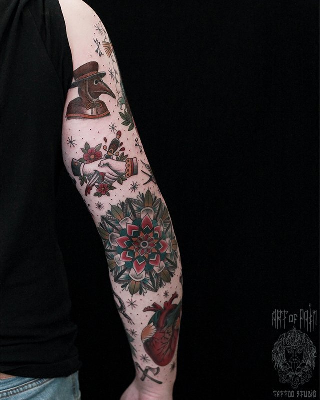 Татуировка мужская олд скул тату-рукав мандала, руки, чумной доктор, сердце (Анастасия Родина) 4342