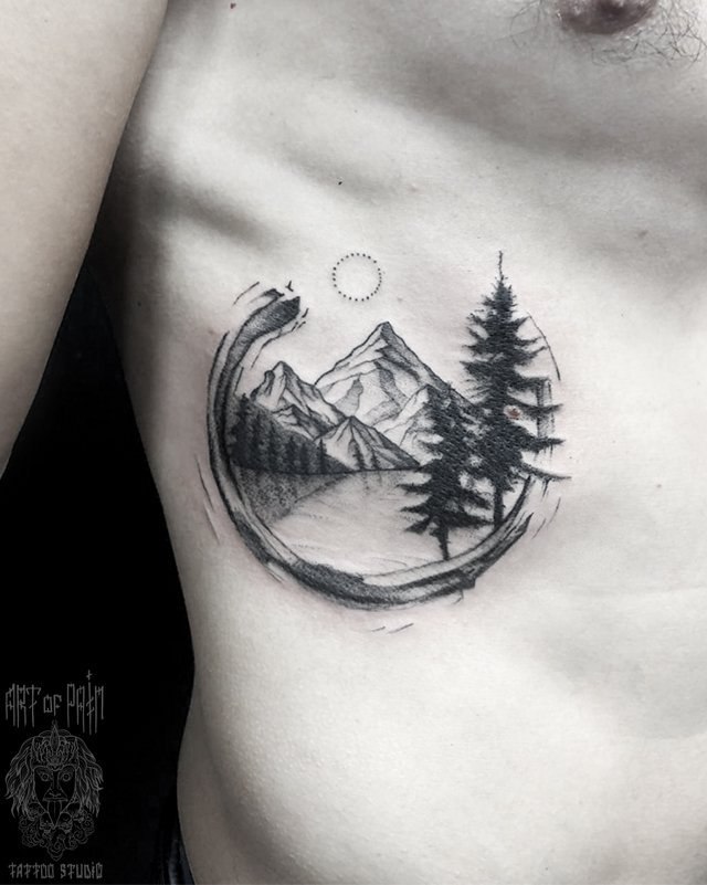 Татуировка мужская графика на боку пейзаж (Мария Котова) 4349