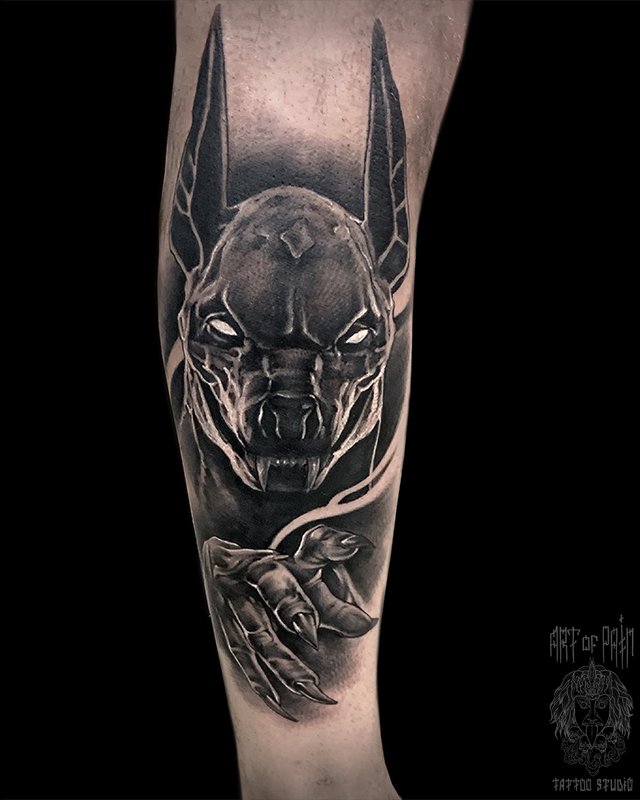 Татуировка мужская хоррор на голени анубис 4353