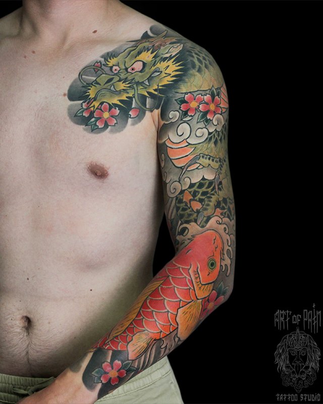 Татуировка мужская япония тату-рукав зеленый дракон и карп 4354