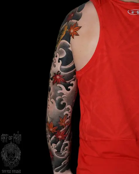 Татуировка мужская япония тату-рукав волны, карпы, клен 4358