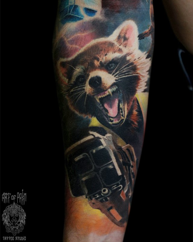 Татуировка мужская реализм на предплечье марвел енот 4371