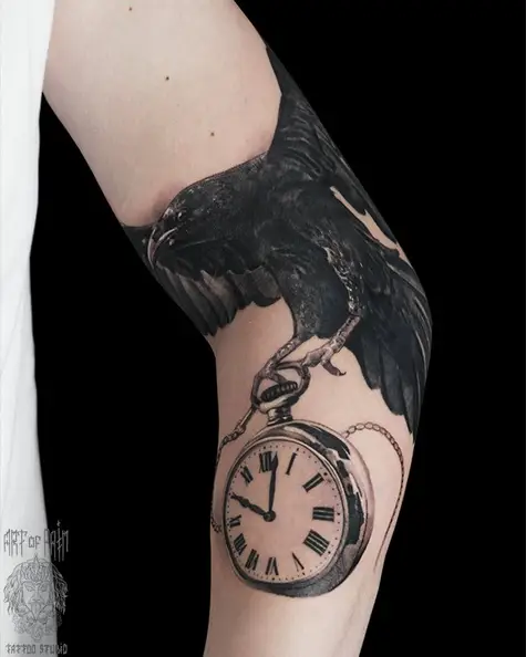 Татуировка мужская реализм на руке ворон с часами 4382