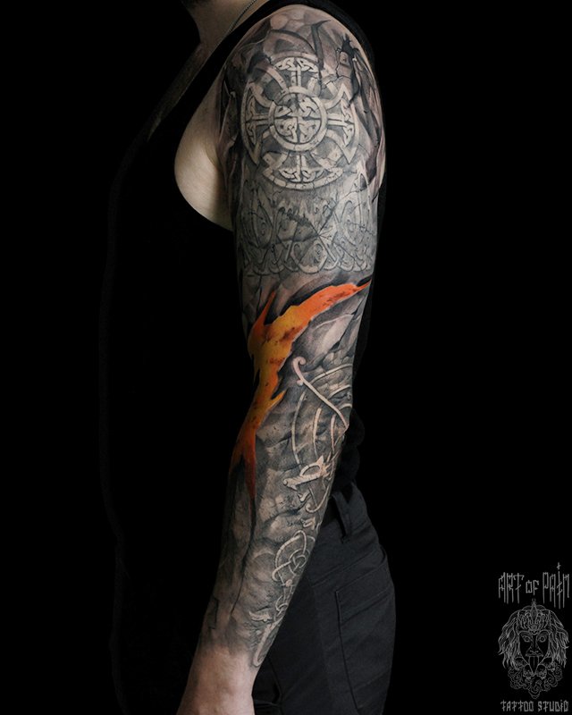 Татуировка мужская реализм тату-рукав кельтский орнамент, пламя, земля 4384