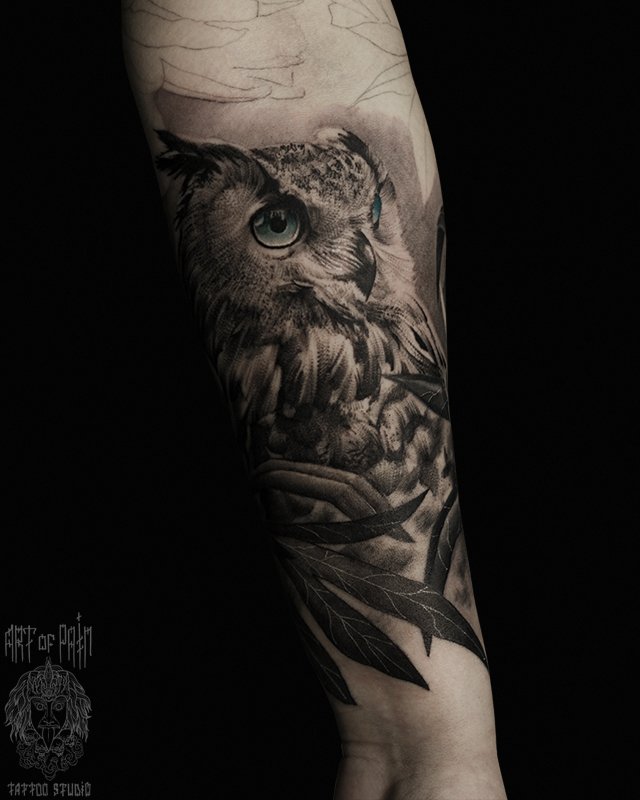Татуировка мужская реализм на предплечье сова с голубыми глазами 4387