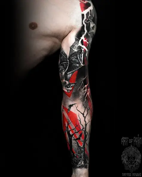 Татуировка мужская треш полька тату-рукав летучие мыши и лес (Слава Tech Lunatic) 4404