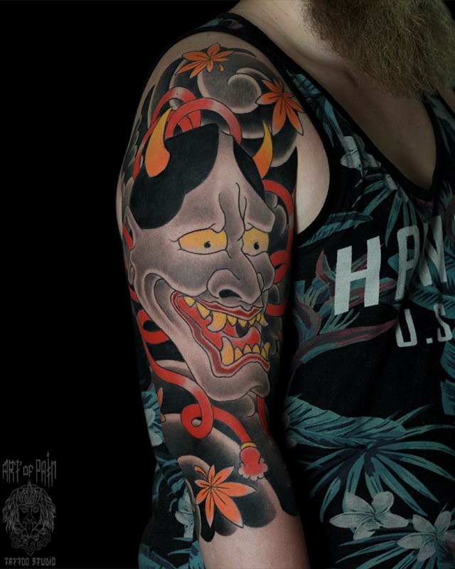 Татуировка мужская япония на плече ханья и кленовые листья 4410