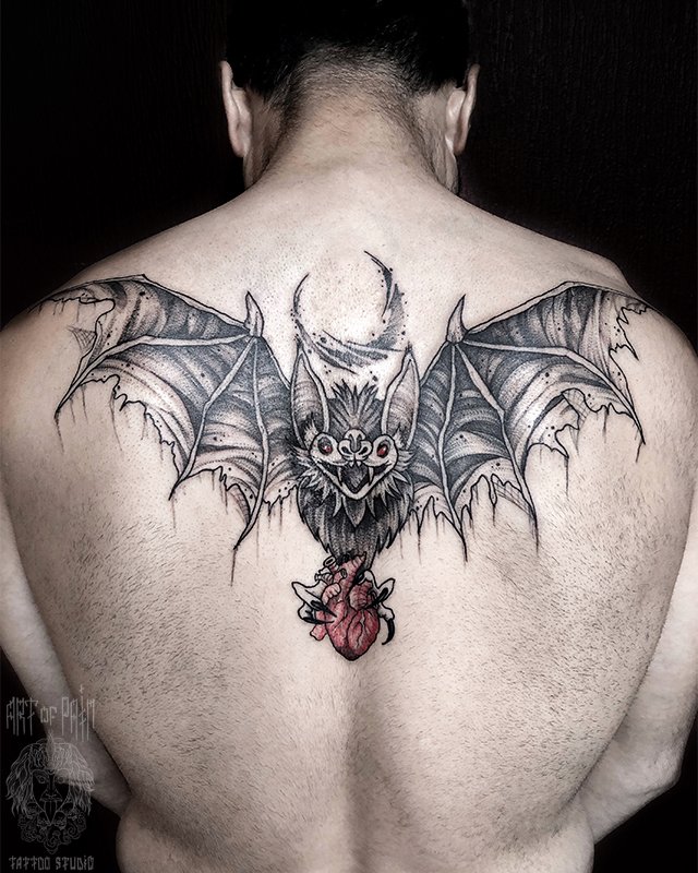 Татуировка мужская графика на спине летучая мышь (Мария Котова) 4424