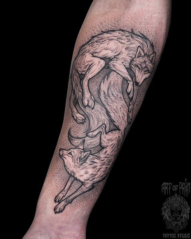 Татуировка мужская графика на предплечье волк и лиса 4471