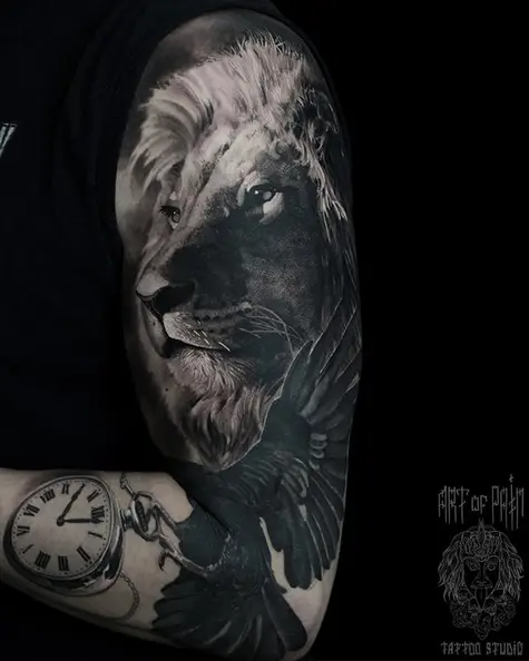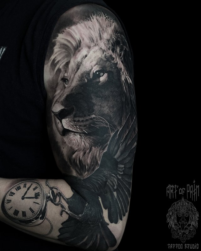 Татуировка мужская реализм на плече лев и птица с часами (Александр Pusstattoo) 4493