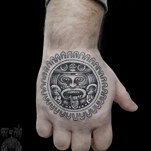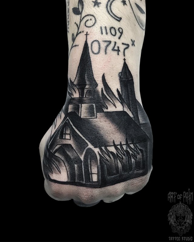 Татуировка мужская олд скул на кисти дом и пожар 4499