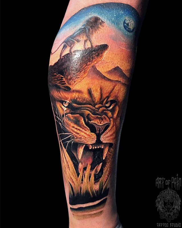 Татуировка мужская реализм на голени лев 4503