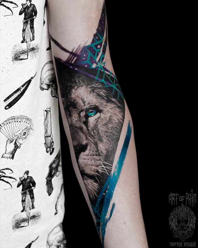Татуировка мужская реализм и акварель на предплечье лев 4553