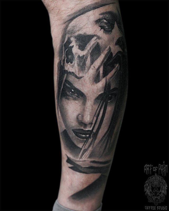 Татуировка мужская реализм на голени девушка 4573