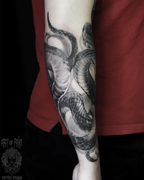 Татуировка мужская реализм на руке (предплечье) змея 4582