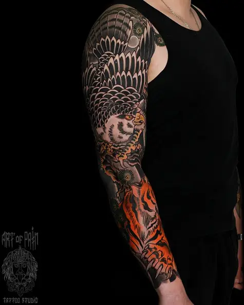 Татуировка мужская япония тату-рукав тигр и орел 4587