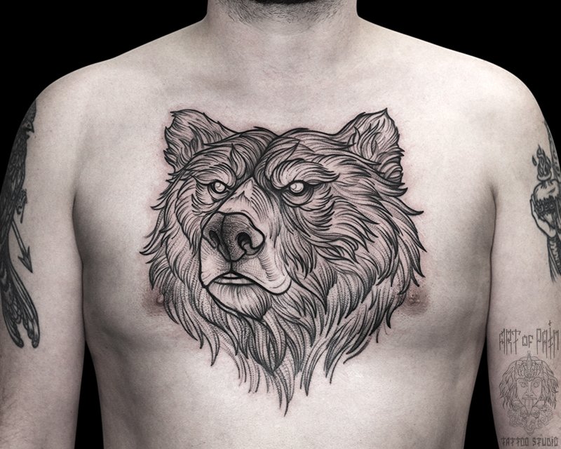Татуировка мужская графика на груди медведь 4618