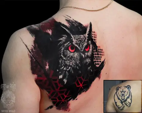 Татуировка мужская реализм и орнаментал на лопатке сова кавер 4625