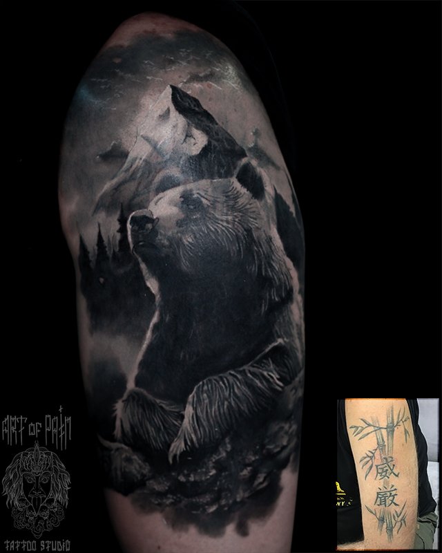 Татуировка мужская реализм на плече медведь кавер 4626
