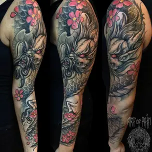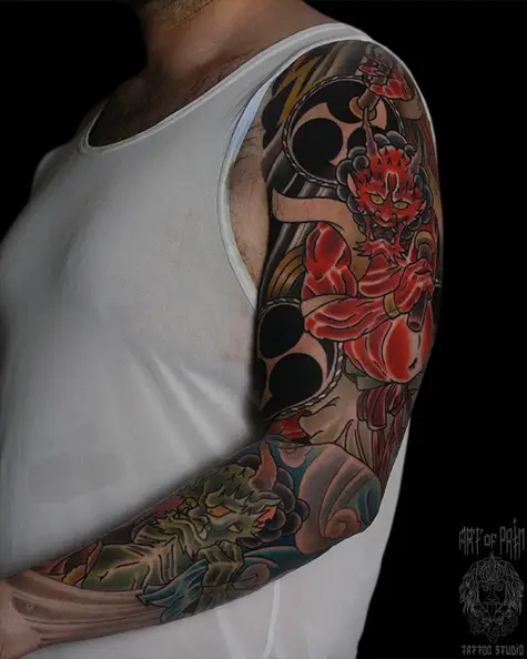 Татуировка мужская япония тату-рукав демоны и символы 4629