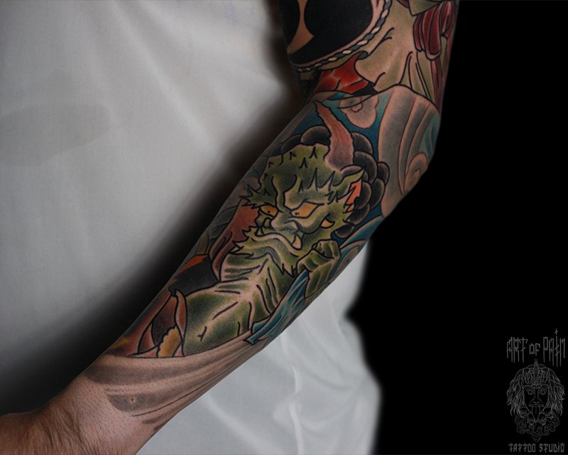 Татуировка мужская япония на предплечье зеленый демон 4630