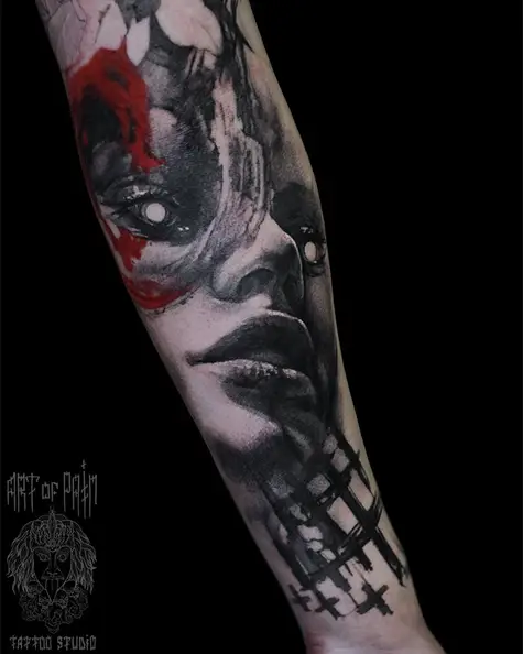 Татуировка мужская реализм на предплечье лицо девушки 4640