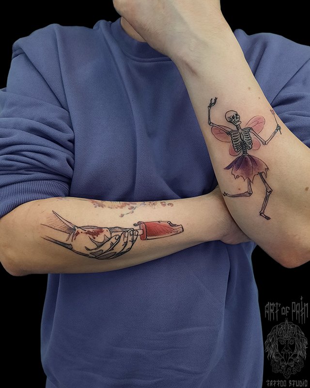 Татуировка мужская графика на предплечьях рука с мороженным и фея скелет 4642
