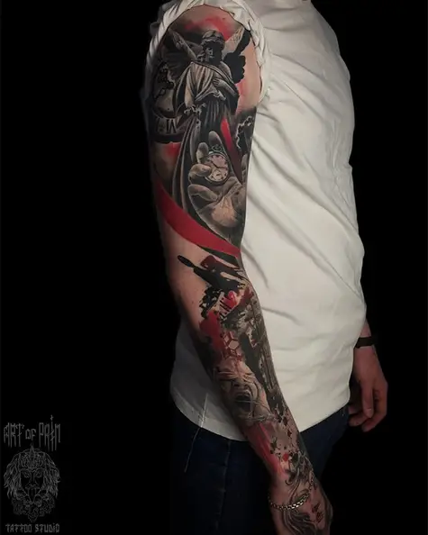 Татуировка мужская реализм тату-рукав ангел, рука, часы, девушка (Анастасия Юсупова) 4649