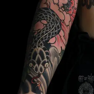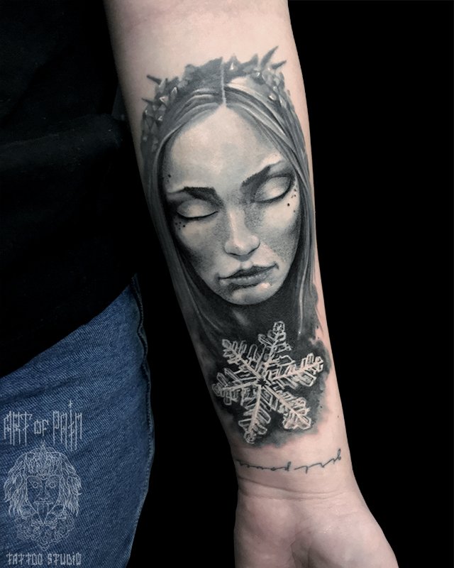 Татуировка мужская реализм на предплечье девушка и снежинка 4652